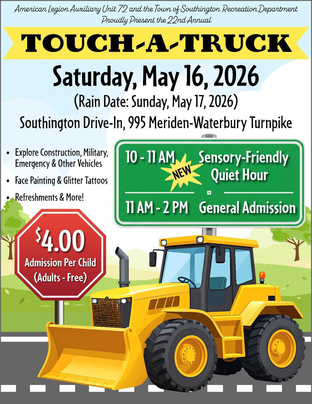 The 22nd annual Touch-a-Truck event is proudly co-sponsored by the American Legion Auxiliary Unit 72 and the Town of Southington Recreation Department.