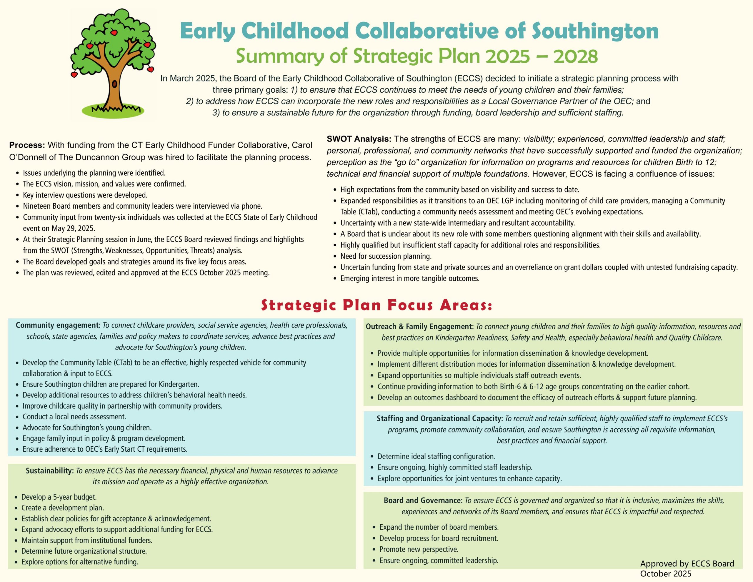 Connecticut’s adoption of Early Start CT in 2024 provided both opportunities and challenges for the Early Childhood Collaborative of Southington (ECCS) and other local early childhood collaboratives. Opportunities for sustained state support were coupled with additional roles and responsibilities as a Local Governance Partner (LGP) of the OEC. Given the need to update the existing strategic plan, incorporate the new LGP role and address ECCS’s sustainability, the ECCS Board decided to initiate a strategic planning process in March 2025.